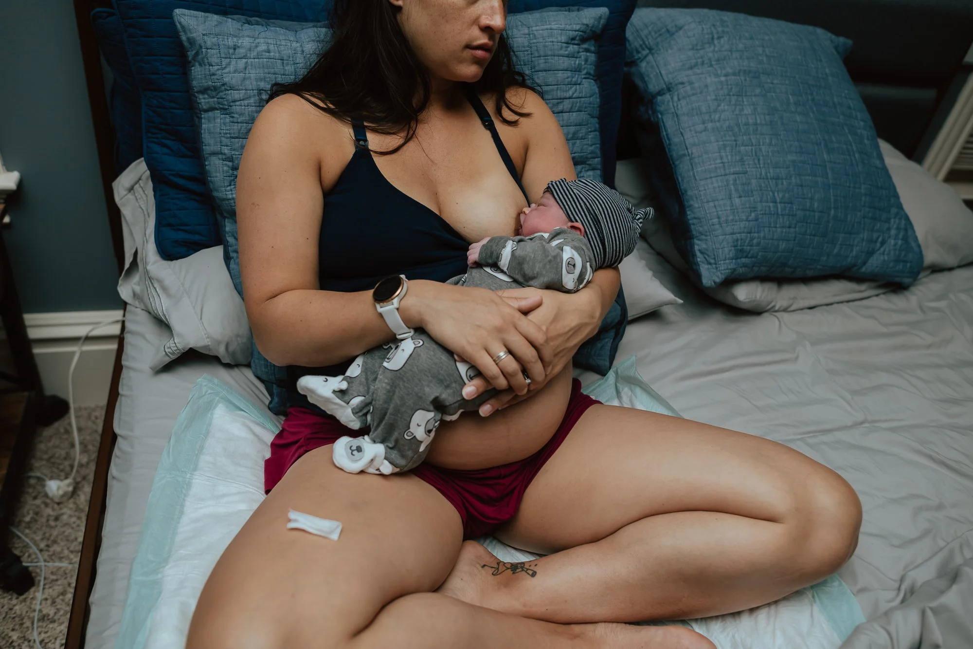 And just like that. In the space between the shower mat and the bathroom floor, with her husband behind her, barely big enough space for a midwife to kneel in, a birth photographer to photograph over and a doula on standby with encouragement….this sweet baby boy was born.